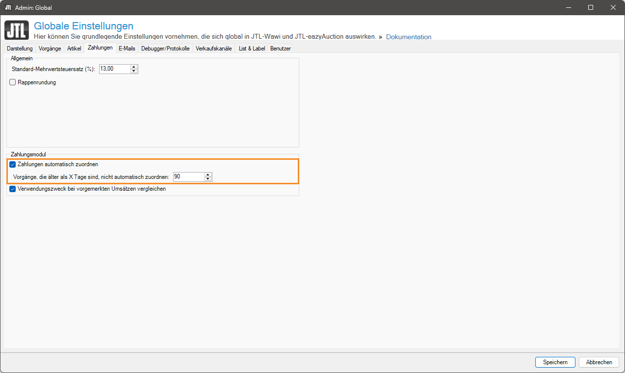 Um Zahlungen nach dem Zahlungsabgleich automatisch von JTL-Wawi zuweisen zu lassen, müssen Sie einmalig eine Einstellung in den globalen Einstellungen vornehmen.