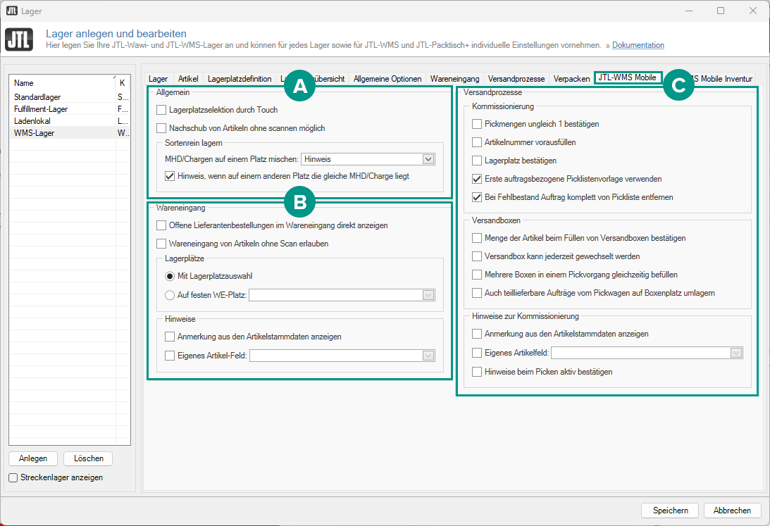 Detailbeschreibung: Lageroptionen Registerkarte JTL-WMS Mobile
