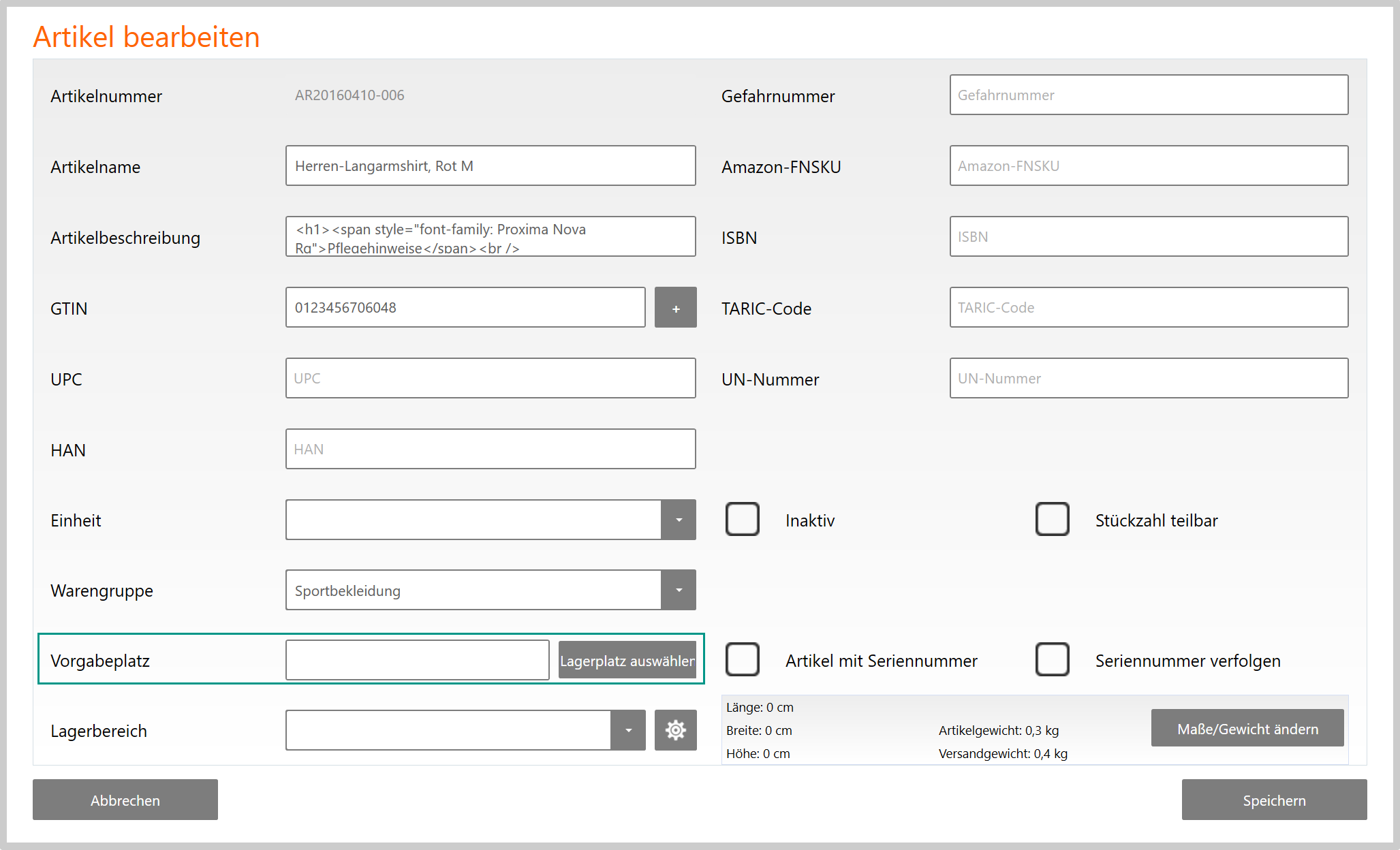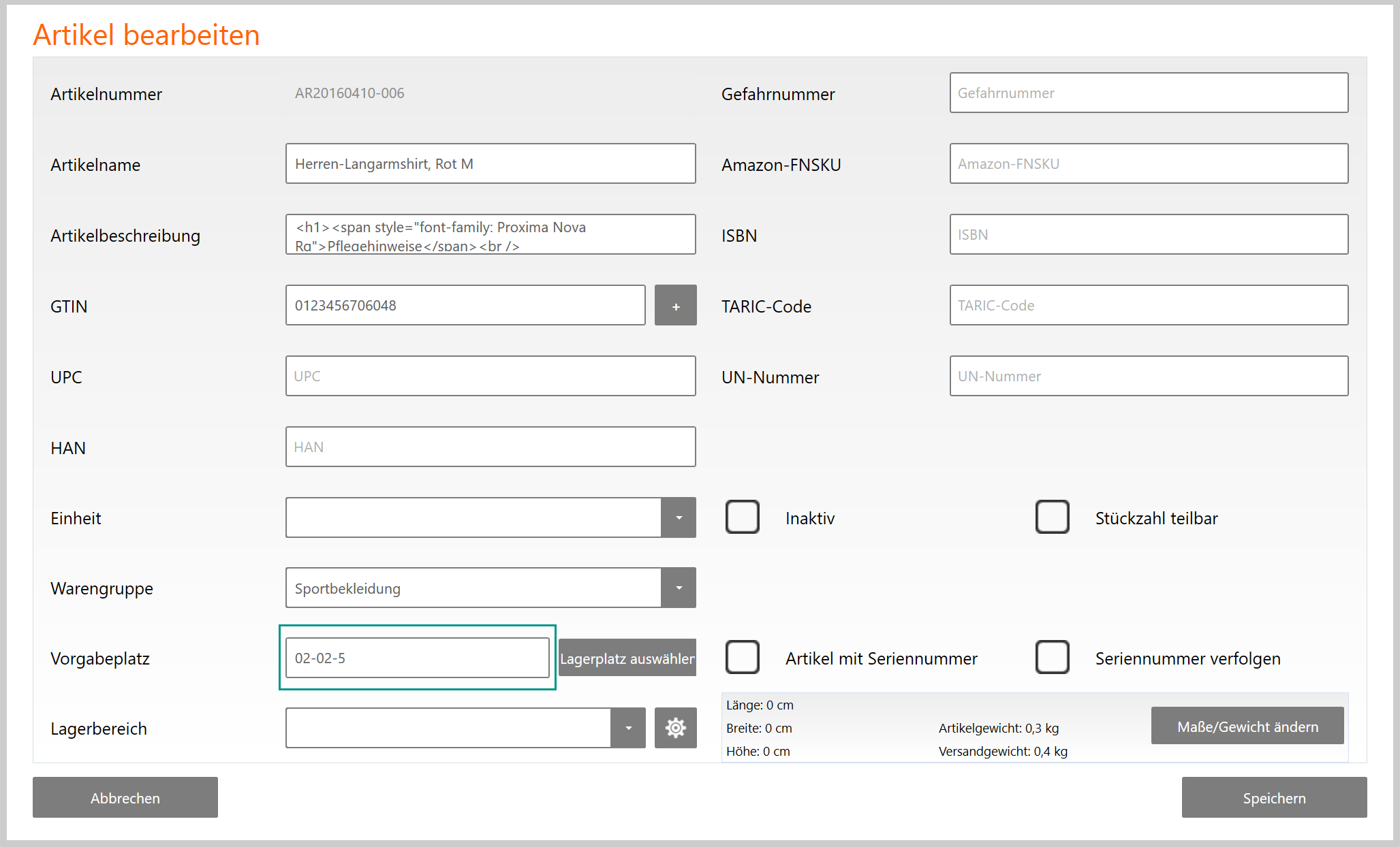 - Klicken Sie auf die Schaltfläche Lagerplatz wählen, um den Lagerplatz zu übernehmen. Die Ansicht springt zurück in das Dialogfenster Artikel bearbeiten.
