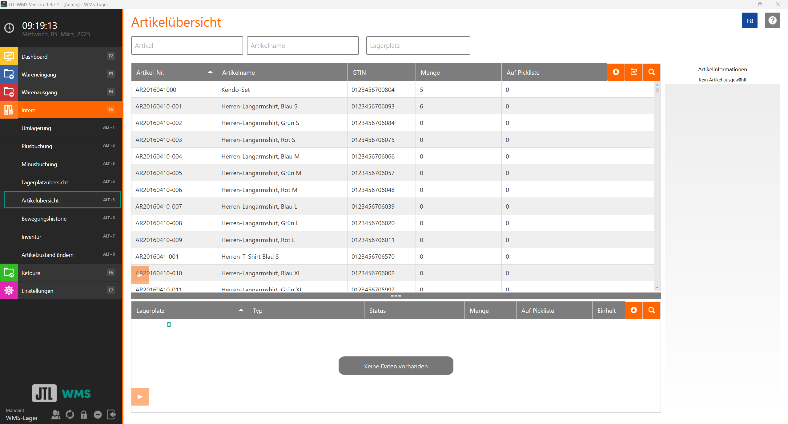 - Öffnen Sie in JTL-WMS die Artikelübersicht über den Menüpunkt Intern > Artikelübersicht.