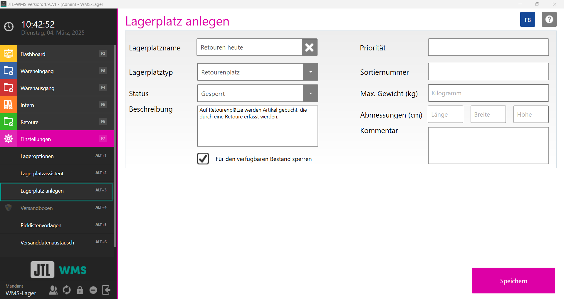 Kommentar: Hier können Sie einen Kommentar oder Hinweis hinterlegen. Diese können in den Informationen zum Lagerplatz in JTL-WMS und in JTL-WMS Mobile angezeigt werden.