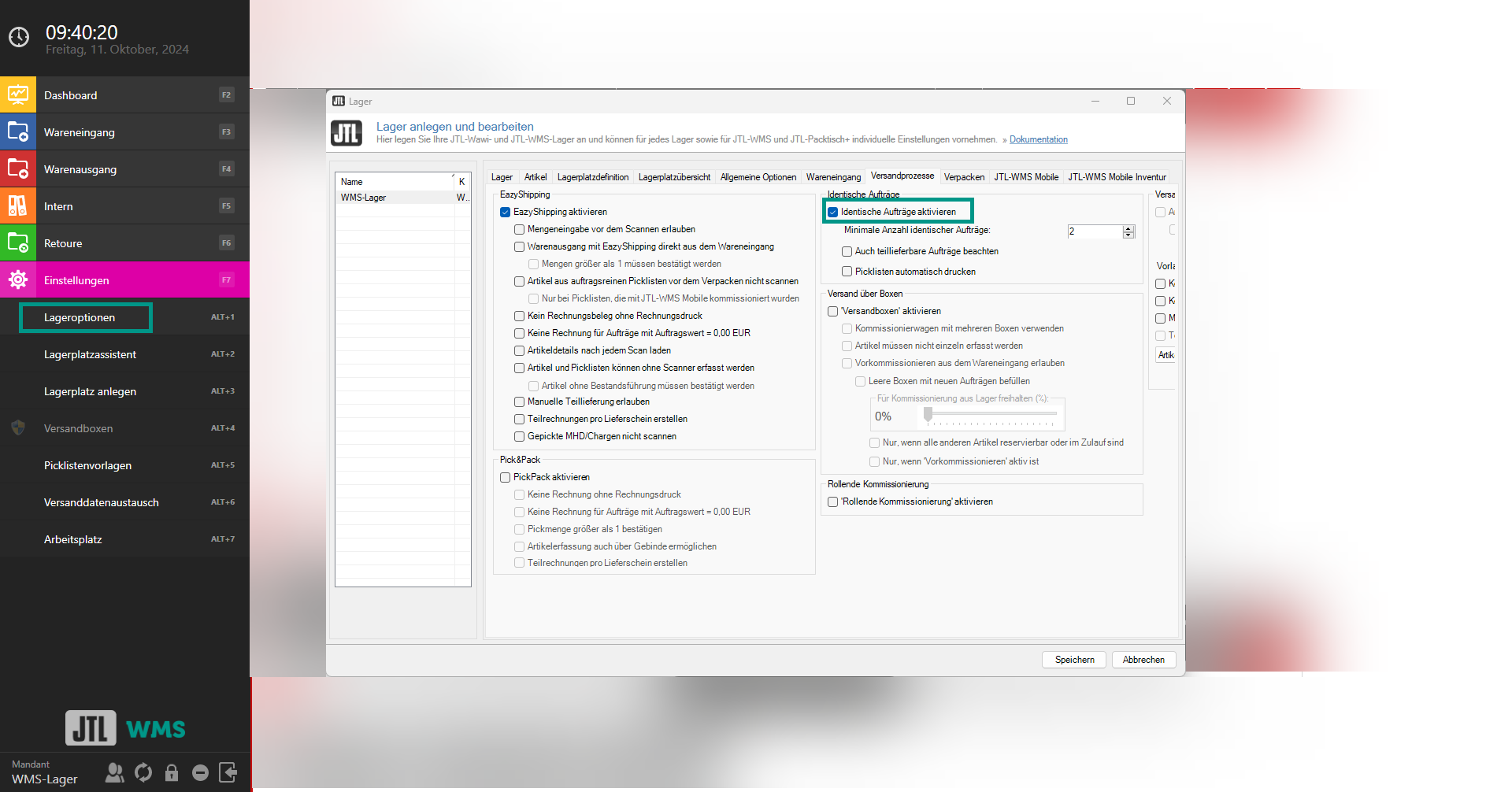 2. In der Registerkarte Versandprozesse im Bereich Identische Aufträge aktivieren Sie die Option Identische Aufträge aktivieren. Für eine genaue Beschreibung der einzelnen Optionen lesen Sie Detailbeschreibung Lageroptionen Registerkarte Versandprozesse.