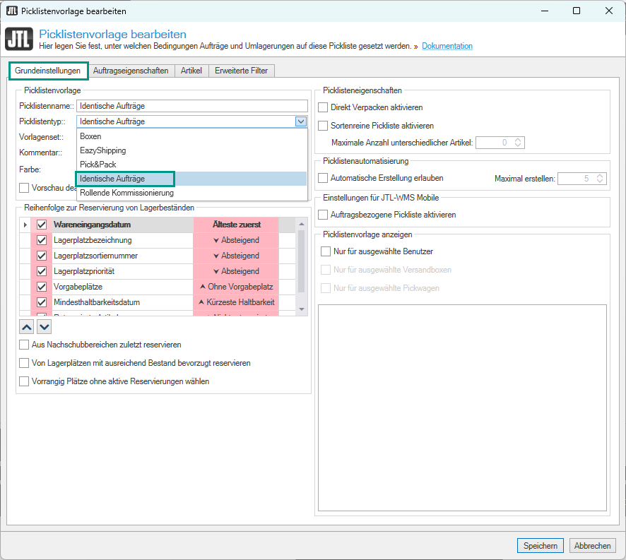 3. Öffnen Sie in der Registerkarte Grundeinstellungen im Bereich Picklistenvorlage bei Picklistentyp das Dropdown-Menü und wählen Sie Identische Aufträge.