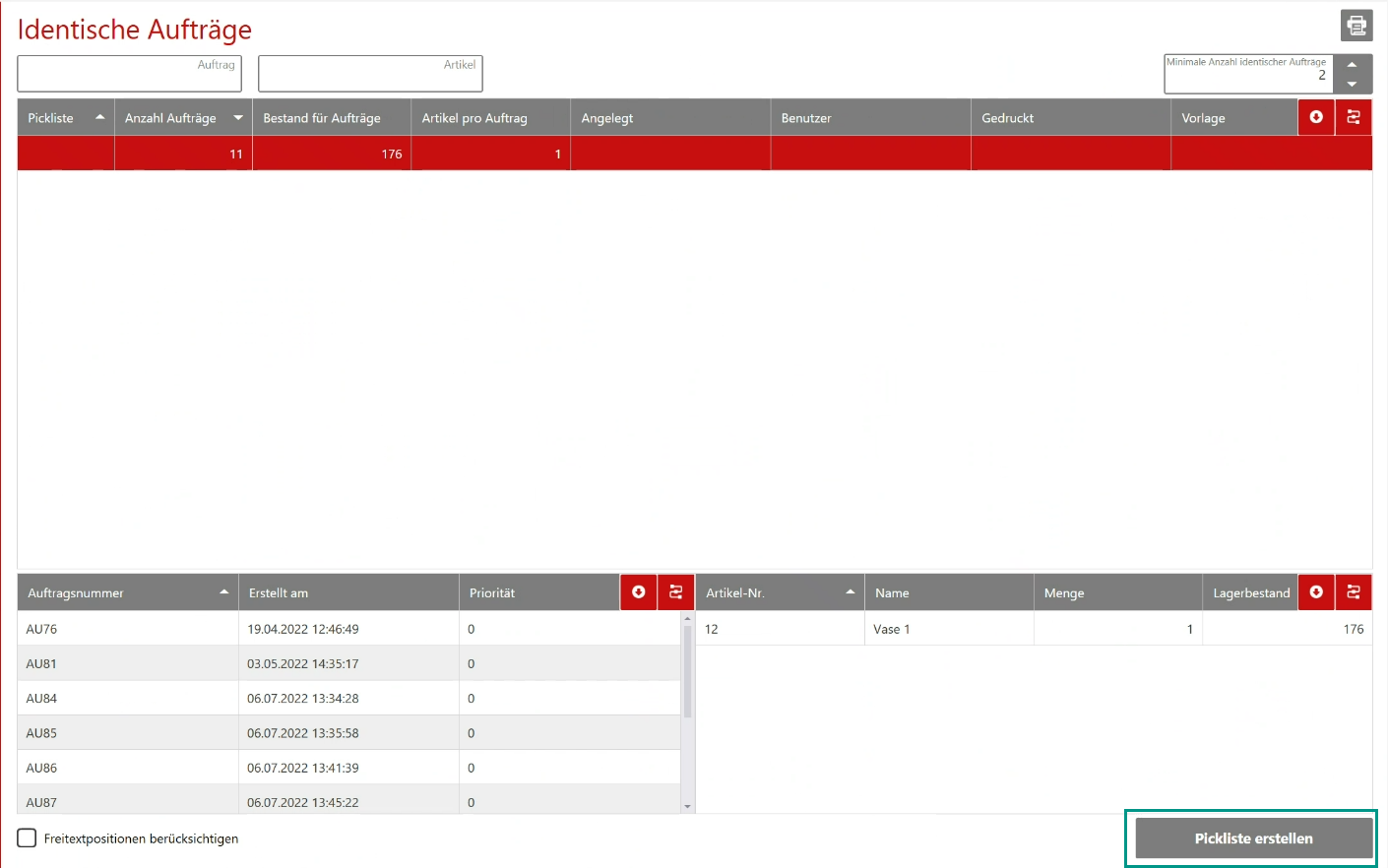 Pickliste für identische Aufträge erstellen