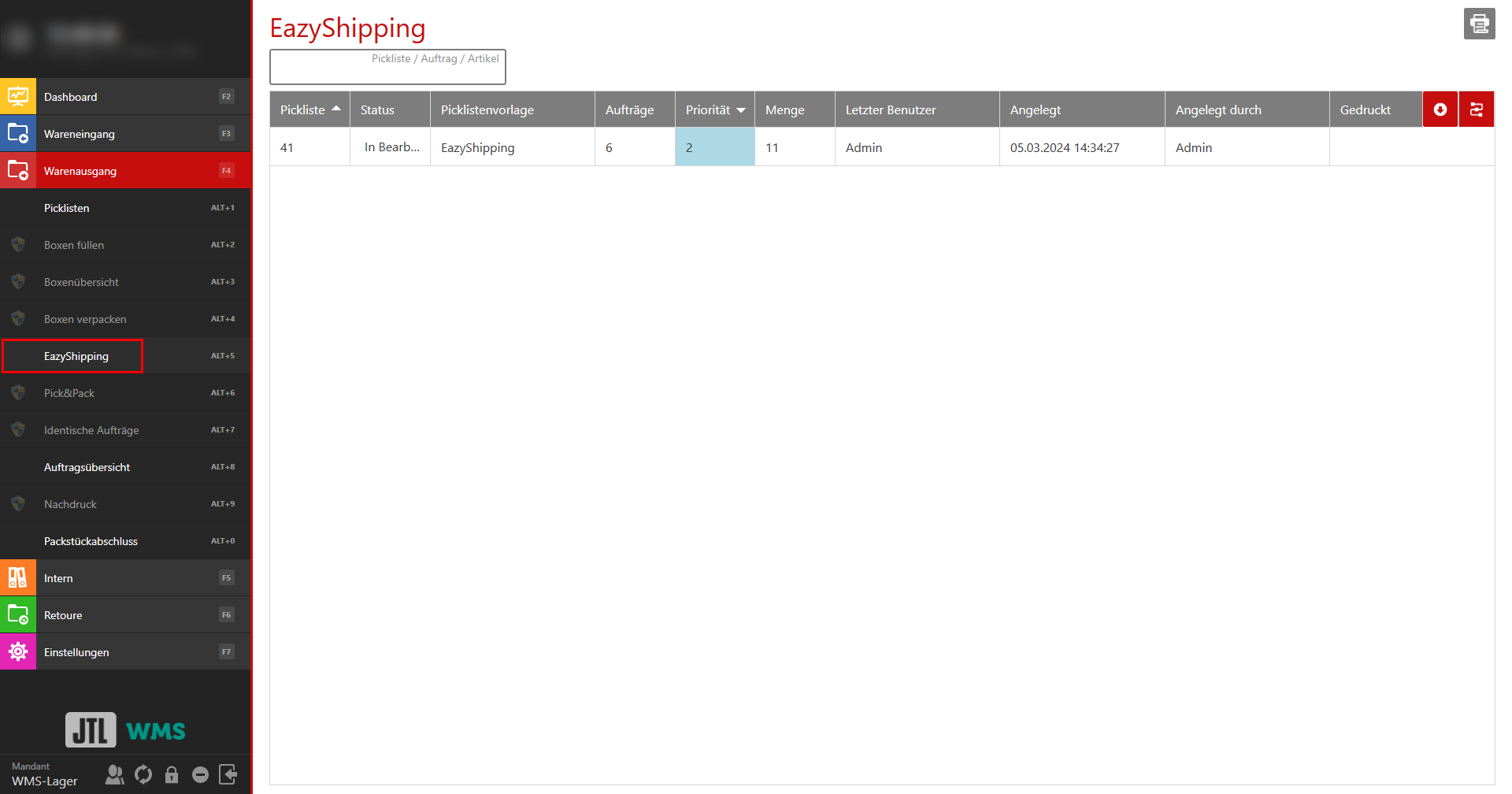 - Klicken Sie auf das Burger-Menü und öffnen Sie über Menü: Warenausgang > EazyShipping die Seite EazyShipping.