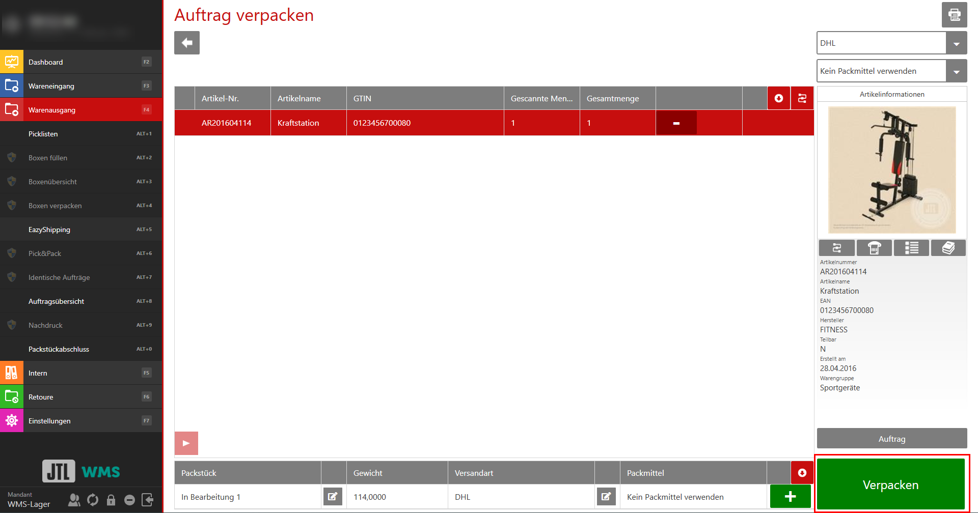 In diesem Abschnitt wird der Prozessablauf in WMS mit der Funktion „Versandstraße“ exemplarisch durchgeführt.