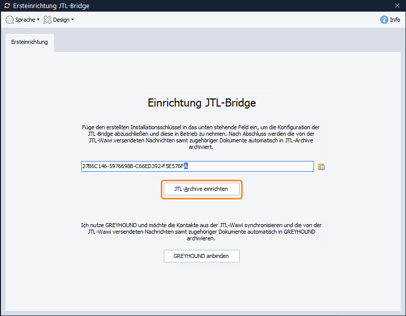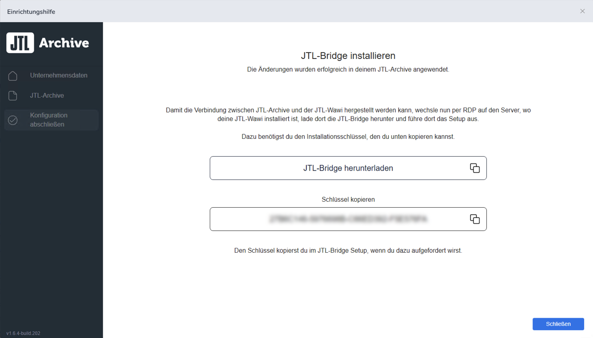 2. Fügen Sie den kopierten Schlüssel in das Feld ein und klicken Sie auf die Schaltfläche JTL-Archive einrichten.