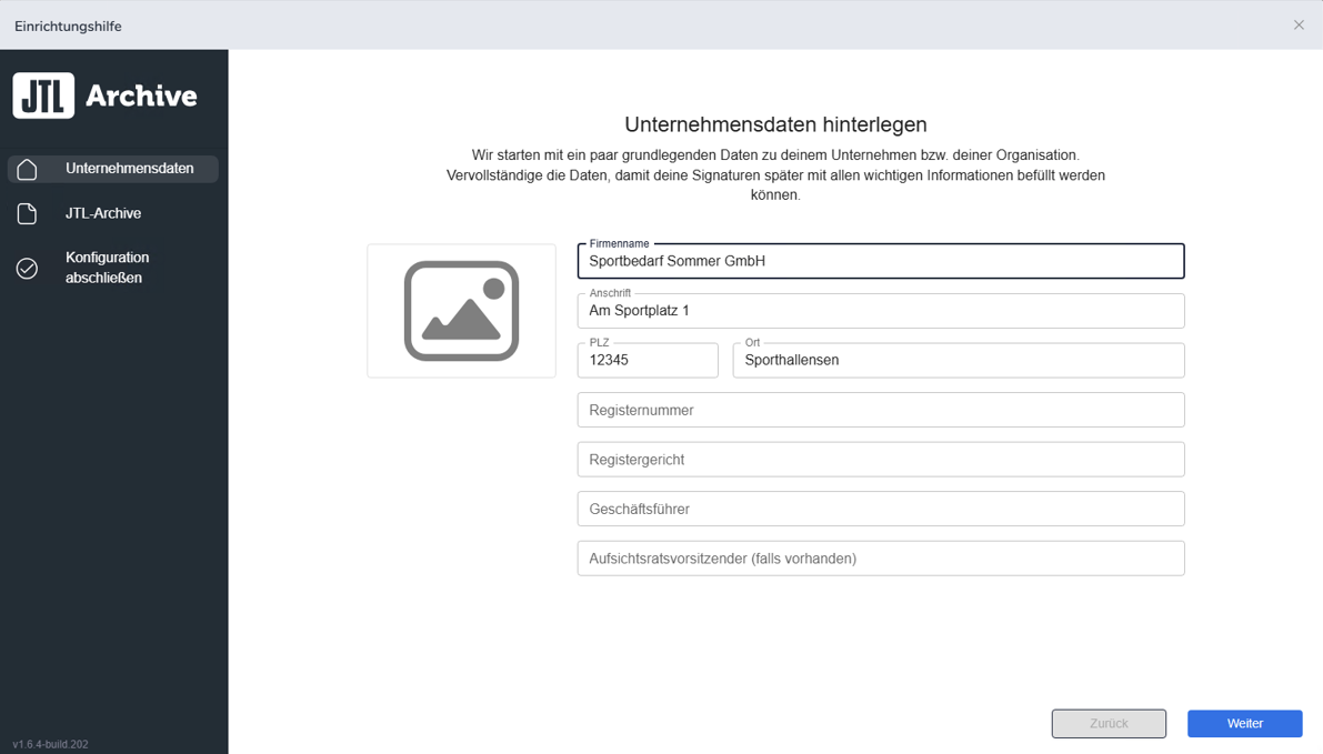 3. Tragen Sie im ersten Schritt Ihre Unternehmensdaten ein und klicken Sie auf Weiter.