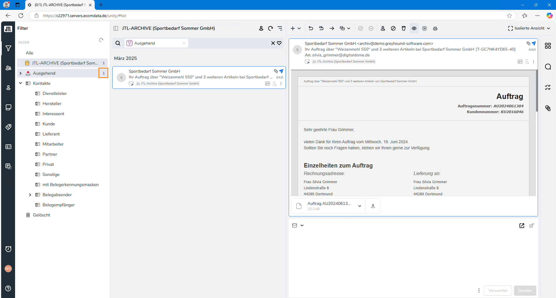 Der Auftrag wird an „Frau Silvia Grimmer“ und an JTL-Archive gesendet. Folgend wird gezeigt, wo Sie die Dokumente in JTL-Archive finden.